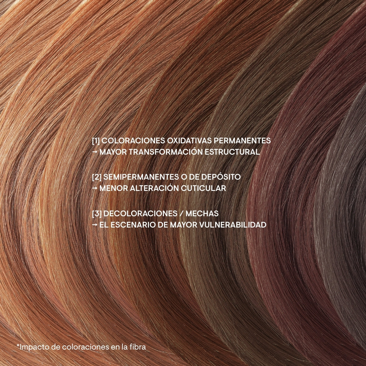 Resultado esperado: un cabello que conserva brillo, suavidad y una apariencia luminosa del color. La fibra se percibe más flexible, manejable y con menor tendencia al encrespamiento.